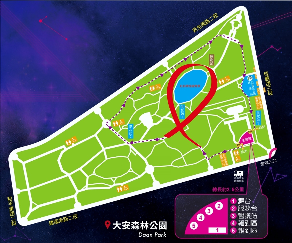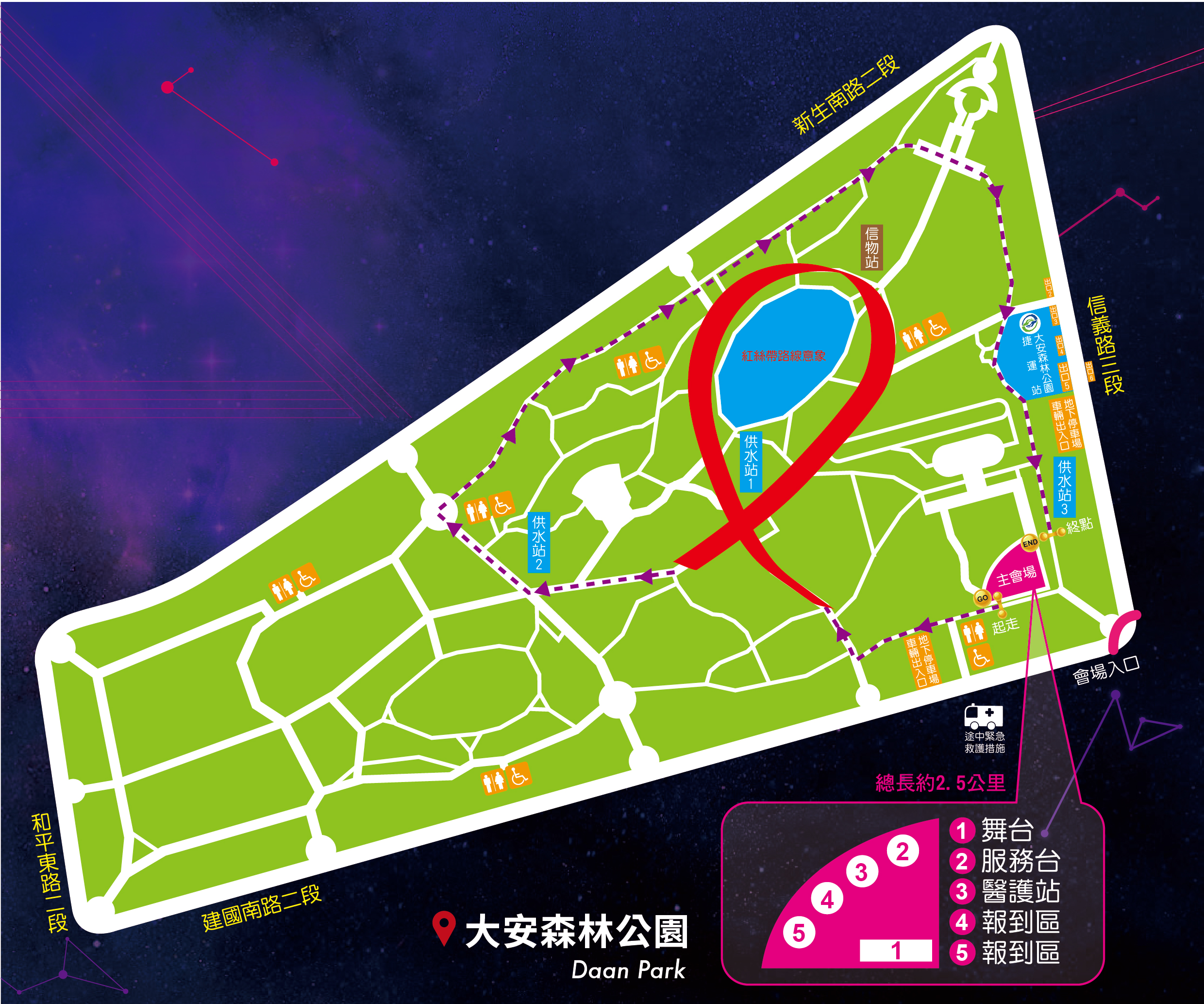 自大安森林公園捷運站五號出口步行約一分鐘即可到會場,完成報名後後領取螢光棒,沿著建國南路二段一側行走繞過公園內的湖泊一圈後,途中需領取認證戳章作為確認,沿途請依工作人員指引方向,最後走回主會場領取宣導品。